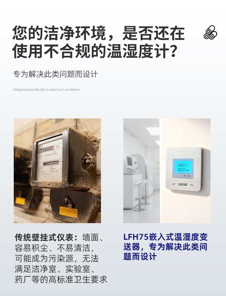 LFH75嵌入式溫濕度變送器系列是一款專為潔凈環(huán)境開發(fā)的溫濕度變送器,產(chǎn)品表面采用不銹鋼金屬面板,嵌入式的安裝方式使得其可與墻面保持齊平,大大減少灰塵等附著,滿足潔凈環(huán)境清潔的要求;同時進口濕敏電容保證了產(chǎn)品的精度和長期穩(wěn)定性;另外可更換式的探頭又方便了產(chǎn)品的日常使用和維護。LFH75嵌入式溫濕度變送器是潔凈室、實驗室、隔離病房、動物房等場所溫濕度測量的理想選擇。